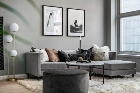 Interiørdekorasjon: Detaljert dekorering av rom med fokus på farger, tekstiler, møbler og belysning.