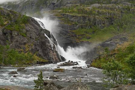 Der dritte von den 4 grossen Fällen im Tal der Wasserfälle bei Kinsarvik. Vor der Alm an deren Ende der Wasserfall 80.meter tief über die Felsen herabstürzt muss man von der Wanderroute wieder sachte absteigen. An den Wasserfallfuß direkt gelangt man nicht ganz heran, der weitere Weg hinauf führt links davon hinauf.